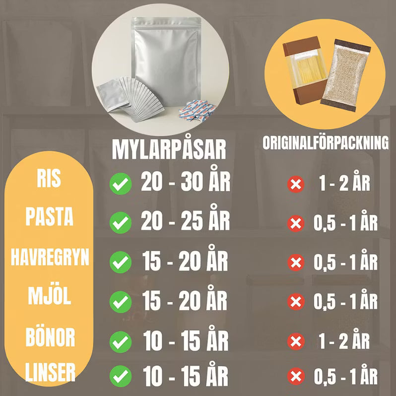 Bygg upp ett eget matförråd med Krisskydds EU-certifierade Mylarpåsar – för trygg matförvaring i upp till 30 år.